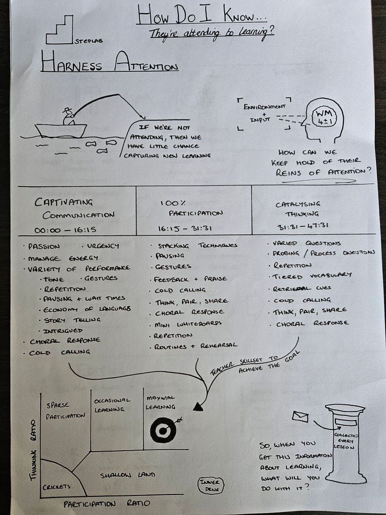 Steplab’s video Great Teaching Unpacked: Episode 1 – Harnessing Attention, so clearly shows if students aren’t attending, they have little chance of capturing new learning — no matter how great the lesson plan is. And for us, developing our pedagogical armoury, keeping hold of the reins of attention in every moment, in every lesson, is fundamental.